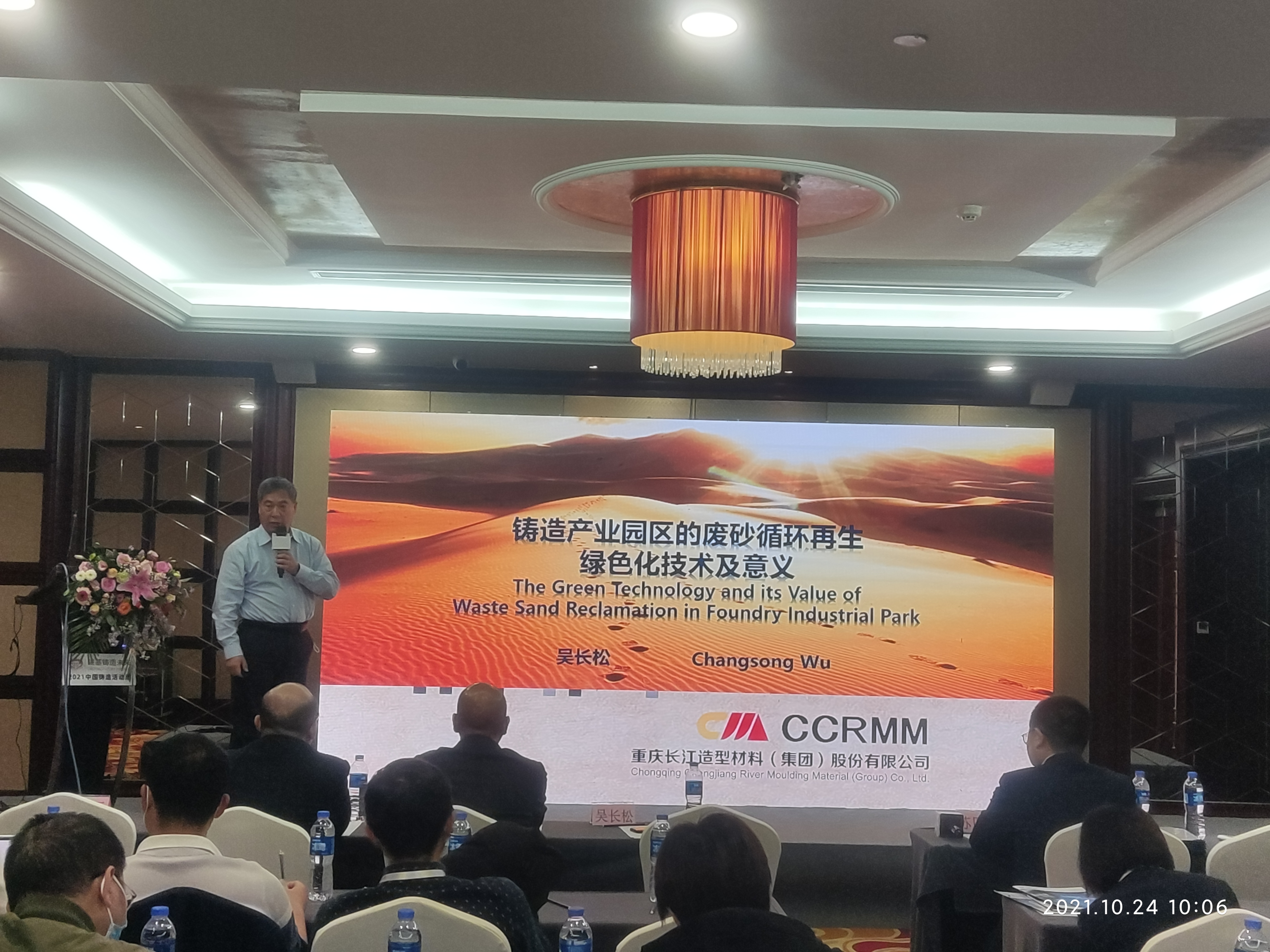 在创新成果展示与交流上,集团副总经理吴长松和韩跃,分别作了题为《铸造产业园区废砂循环再生绿色化技术及意义》和《铸造废砂再生及资源化应用技术发展》的演讲。